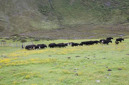 走到一處草坪,南杰和吉美下馬一起去扶雍貝,說是在此處稍作歇息。雍貝的臉色恢復(fù)了紅潤(rùn),他取下盤香枝插進(jìn)吉美濃密的頭發(fā)里,兩人由此發(fā)出了嬉笑聲。馬兒徑自走向草坪深處的水洼里飲水,打著酣暢的響鼻,頸項(xiàng)上銅鈴鐺隨馬兒鬃毛的抖動(dòng)發(fā)出了“鐺鐺”的聲音。馬兒飲飽了水,轉(zhuǎn)身朝我們走來。繼續(xù)騎行,不知過了多久,日光在頭頂上游移,漸漸偏西。雍貝在前方問南杰,阿尺,巴烏牧場(chǎng)還有多遠(yuǎn)?南杰指向眼前的山峰說,登上這座峰頂就到了?;赝宦方?jīng)過的河谷,早已不知去向,我們身處的位置幾乎與周遭巍峨的山巒平齊了。我從衣兜里取出手機(jī)測(cè)試海拔高度,4820米。