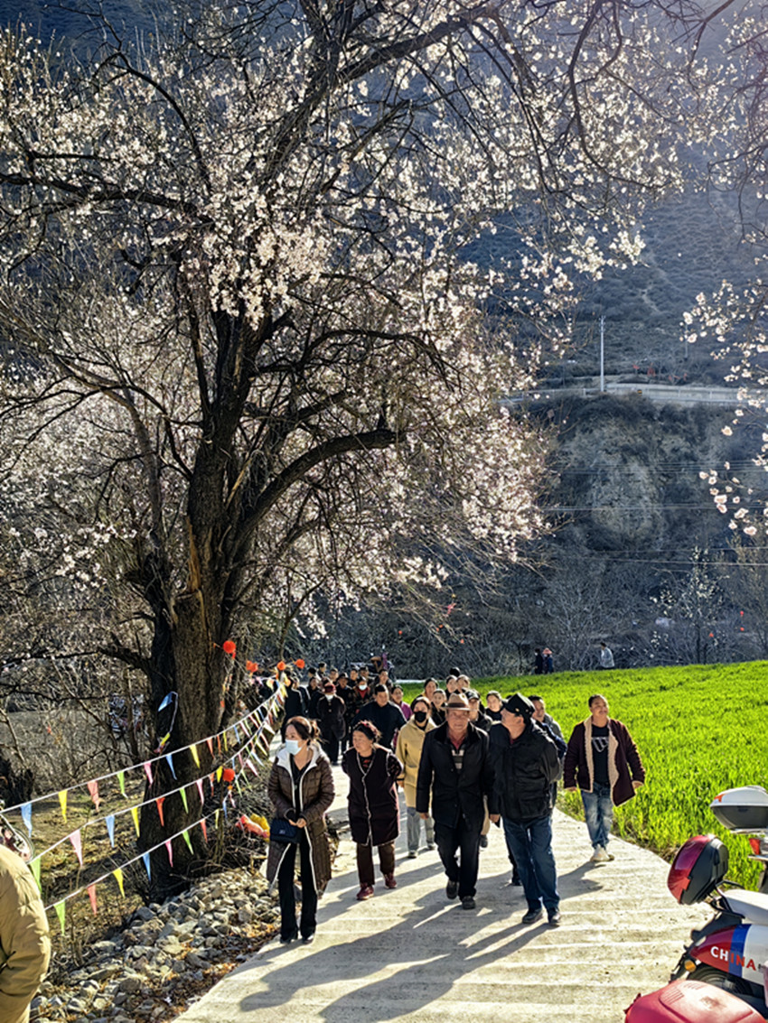 春意枝頭俏,桃花競(jìng)相開。登高遠(yuǎn)望,巍峨青山綿延,山腳麥苗蕩漾,蒼茫山色間,一株株、一叢叢野生桃花星羅棋布點(diǎn)綴其間,加之一棟棟別致藏房掩映其中,春的美麗畫卷就此鋪展開來。