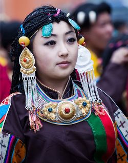 藏裝的基本特點是長袖、寬腰、大襟、肥大。直線寬邊,色彩對比強烈。男女藏袍均習慣以粗紡厚毛呢為料,左襟大,右襟小,一般在右腋下釘一個紐扣,或是用紅、藍、綠、雪青等色布做兩條飄帶,穿時結上。男式藏袍多為黑、白兩色,領圍、袖口、衣襟和底邊,鑲上色布或綢子底邊,古樸渾厚。夏天或勞動時,一般只穿左袖,右袖從后面拉到胸前搭在左肩上,也可左右袖均不穿,兩袖束在腰間,古銅色的皮膚袒露于外,雄風凜凜,彪悍剛健。女式藏袍,分有袖和無袖的兩種,夏秋兩季的藏袍無袖。里面多襯有紅、綠等色彩鮮艷的襯衣,襯衣翻領在外,衣袖要長于胳膊一至二倍,長出部分,平時卷起,舞蹈時放下,舒展飄逸,瀟灑自如。藏族的帽子式樣繁多,各地均有不同,拉薩等地以金寶頂帽為最多,用金絲或銀絲繡織圖案,在陽光照耀下,閃閃發(fā)光。金花帽是男女老幼都喜歡戴的民族帽。男女穿的藏靴,底高二寸,靴腰高至小腿以上,靴面用紅綠相間的毛呢裝飾,繡有圖案花紋。靴頭向上隆起。藏族男女喜歡佩飾。耳穿大環(huán),手腕金銀,頂戴珠鏈,尤其是在腰間,男挎長劍,女佩腰刀,更顯得粗獷彪美。