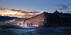 石經(jīng)城位于距石渠縣城呢呷鎮(zhèn)東北約90公里處的阿日扎鄉(xiāng)境內(nèi),坐落在雅礱江支流洛曲河西岸一處兩山相望的草原間,背靠一座平緩、渾圓的山丘,前面是一望無際的草原,由于草原極為遼闊,遠(yuǎn)遠(yuǎn)望去,整座城并不顯得特別雄偉、壯觀,但走近細(xì)看,這座用一塊塊刻滿經(jīng)文和佛像的石片、石塊在漫長(zhǎng)歲月中逐漸壘砌起來的石城,所蘊(yùn)含的厚重與蒼茫,堅(jiān)韌與神秘,讓我想起荷爾德林所說的“那些四處飄游的分散的力量,都匯聚在一個(gè)黃金般的中心”。