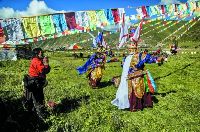 格薩爾王在藏族的傳說里是神子推巴噶瓦的化身,一生戎馬,揚(yáng)善抑惡,宏揚(yáng)佛法,傳播文化,成為藏族人民引以為自豪的曠世英雄。這是筆者在格薩爾誕生地——德格阿須草原現(xiàn)場(chǎng)拍攝的一組照片,它呈現(xiàn)了康巴藏區(qū)送文化下鄉(xiāng),牧民如過節(jié)一樣歡樂的盛況。該組圖片為演出現(xiàn)場(chǎng)。