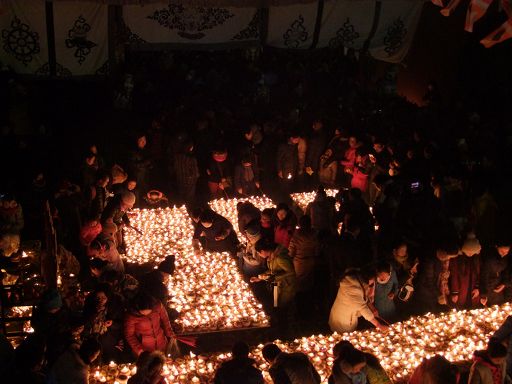 康定的幾座黃教寺廟舉行了法會(huì),擺酥油花,燃元根燈供佛。信教群眾除在家供燈外,有的還登跑馬山,赴南無(wú)寺敬燈油。入夜后又成群結(jié)隊(duì)涌向康定城中的安覺(jué)寺,參加元根燈會(huì),以此紀(jì)念藏傳佛教格魯派創(chuàng)始人、宗喀巴大師圓寂成佛。安覺(jué)寺里人潮涌動(dòng),熱鬧非凡。有扶老攜幼的信教群眾,有祈求平安的生意人,也有慕名而來(lái)的外地?cái)z影師。燈會(huì)這天,最忙碌的除了寺廟里的喇嘛,就數(shù)在寺廟周圍站崗的消防員了,消防員李剛說(shuō):“一大早就有遠(yuǎn)道而來(lái)的信教群眾和僧尼到寺廟里點(diǎn)燈了,為了保障寺廟的消防安全,我們已經(jīng)在這飄著雪花的冬日里站了整整一天了,要等到每一盞燈都安全的燃盡,我們才可收隊(duì)離開(kāi)。”