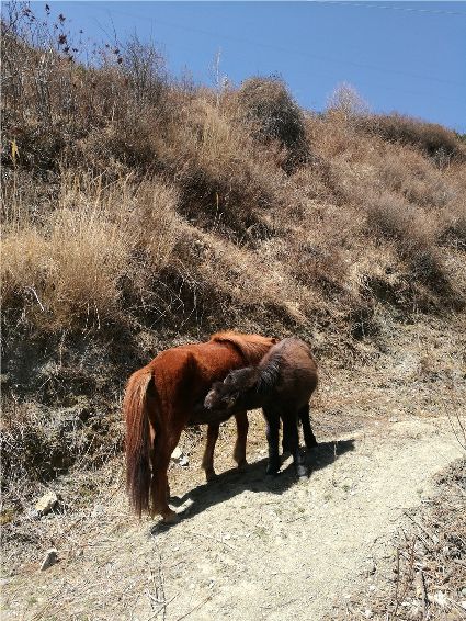 晴天里有陽(yáng)光,陽(yáng)光總是充滿(mǎn)愛(ài)和溫馨,無(wú)論人或是動(dòng)物,母愛(ài)都是最寶貴的甘露。行走在阿里布果,無(wú)限愜意油然而生,徜徉在陽(yáng)光的懷抱,心寧而靜。突然,馬鳴聲打破了這份寧?kù)o,一匹黃馬一邊吃著草,一邊吼叫,不一會(huì)兒,一匹小馬駒飛奔而來(lái),走到黃馬身旁,吮吸著甘甜的乳汁。天很藍(lán),陽(yáng)光很溫暖,世上有一種最美麗的聲音,那便是母親的呼喚。