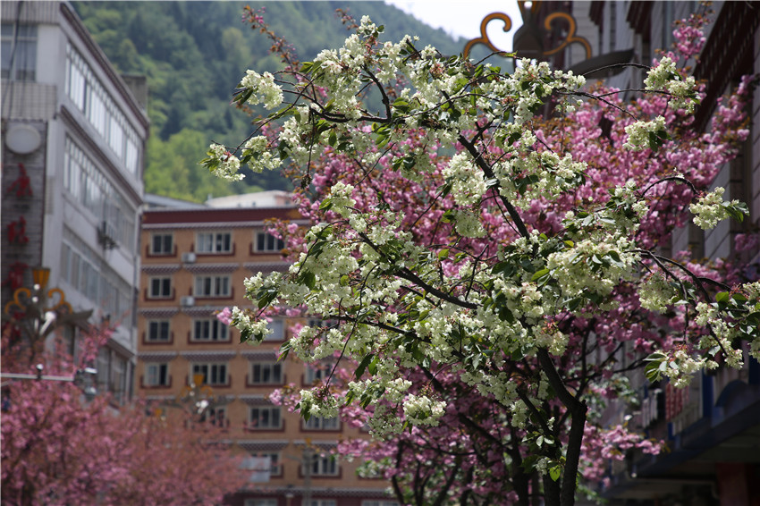 當(dāng)春天遇見(jiàn)最美的櫻花時(shí),驚艷了整個(gè)康定。櫻花與身邊人都將成為春日里的浪漫風(fēng)景。櫻花之美,美在氣勢(shì),櫻花紛飛,夢(mèng)幻唯美。每年4月中旬,康定城北門的櫻花綻放后,人們像是約好了一樣聚集到這里,共赴這一場(chǎng)甜美盛宴。這一路繁花似錦,人們穿過(guò)枝椏花正盛的櫻花林,穿過(guò)粉色海洋,徑直奔向一個(gè)浪漫的童話,一路櫻花飄散,一路粉光燦爛。櫻花絢麗繽紛、陸續(xù)綻放,若恰逢一陣春風(fēng)經(jīng)過(guò),櫻花瓣隨風(fēng)舞動(dòng),猶如紛落的雪花,空氣中浮動(dòng)著櫻花特有的淡淡香氣,令人不禁懷疑自己置身夢(mèng)境?!翱刀ǖ拇禾靵?lái)得要晚一些,綻放的櫻花,滿街的花草,折多河畔楊柳依依,康定的春天無(wú)比驚艷,醉了游人。”周先生一邊拍照,一邊感嘆,他在康定生活了40多年,20年前的康定,可以說(shuō)找不到像樣的花草樹(shù)木,進(jìn)入新時(shí)代,康定城市變美了,城市綠化走在了前面,城市的美譽(yù)度舒適度不斷提升??刀ㄖ?,春色滿園,姹紫嫣紅,風(fēng)光旖旎。