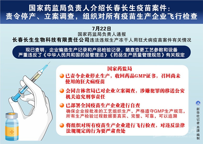國家藥監(jiān)局負責(zé)人22日通報長春長生生物科技有限責(zé)任公司違法違規(guī)生產(chǎn)凍干人用狂犬病疫苗案件有關(guān)情況。這位負責(zé)人說,國家藥監(jiān)局已責(zé)令企業(yè)停止生產(chǎn),收回藥品GMP證書,同時會同吉林省局已對企業(yè)立案調(diào)查,涉嫌犯罪的移送公安機關(guān)追究刑事責(zé)任。國家藥監(jiān)局將組織對所有疫苗生產(chǎn)企業(yè)進行飛行檢查,對違反法律法規(guī)規(guī)定的行為要嚴肅查處。 這位負責(zé)人說,根據(jù)舉報提供的線索,7月5日,國家藥監(jiān)局會同吉林省局對長春長生公司進行飛行檢查;7月15日,國家藥監(jiān)局會同吉林省局組成調(diào)查組進駐企業(yè)全面開展調(diào)查。7月15日,國家藥監(jiān)局發(fā)布了《關(guān)于長春長生生物科技有限責(zé)任公司違法違規(guī)生產(chǎn)凍干人用狂犬病疫苗的通告》。