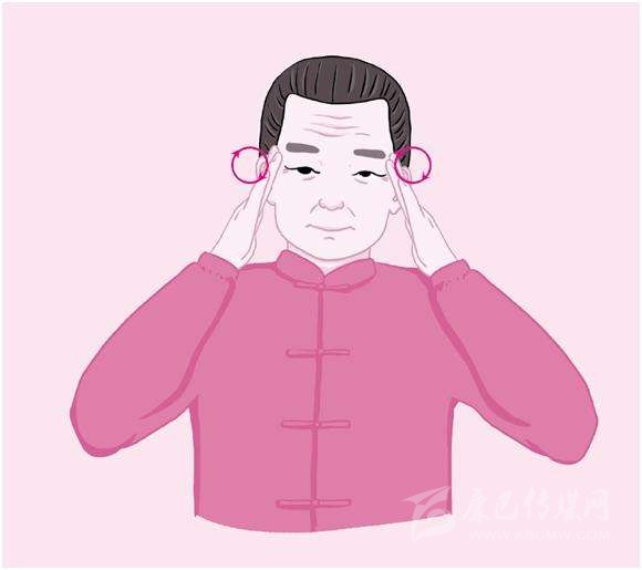 2.按揉太陽穴:順時(shí)針旋轉(zhuǎn)一周為一拍,約做32拍。