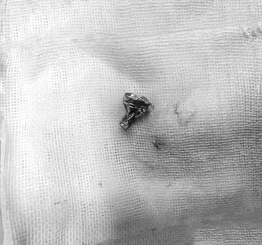 手術(shù)于1月5日13時(shí)開(kāi)始,在醫(yī)院呼吸與重癥醫(yī)學(xué)科、消化胃腸鏡室的支持下,兒科與麻醉科醫(yī)護(hù)人員密切合作,兒科醫(yī)生劉勤、張雪瓊冷靜操作、沉穩(wěn)手術(shù),最終將異物成功取出。經(jīng)仔細(xì)檢查,異物為一扭曲變形的鉛筆頭鋁箍。
