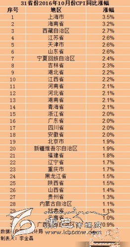 在31個(gè)省份中,上海10月份CPI漲幅全國最高,為3.5%,漲幅比9月回落0.1個(gè)百分點(diǎn)。其次是海南,漲幅為3.2%。上海、海南也是目前全國兩個(gè)CPI漲幅處于“3時(shí)代”的地區(qū)。