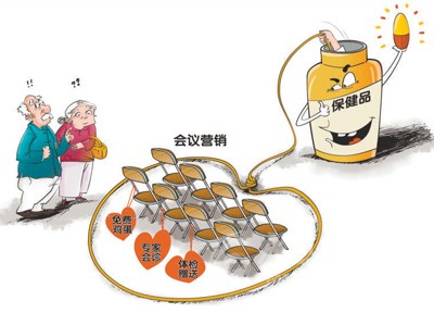 “免費贈禮”作餌是保健品銷售“連環(huán)計”的開端。不少保健品銷售會利用老年人愛節(jié)約的特點,用雞蛋、掛面等價格低廉的“免費禮物”吸引老年人,為老年人組織活動,以此搜集他們的信息,建立初步信任關(guān)系?!敖】祵觥毕茨X則是抓住老年人體弱多病、關(guān)注健康的“痛點”,通過講座、會議等形式組織專場活動,美其名曰是為老年人宣講健康知識、普及養(yǎng)生理念等,實際上最終目標(biāo)是推銷保健品。