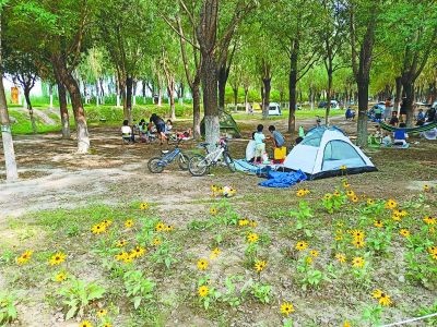 27日,端午小長(zhǎng)假最后一天,在大運(yùn)河森林公園露營(yíng)區(qū),市民在保持安全距離的前提下,支起帳篷,休閑度假。
