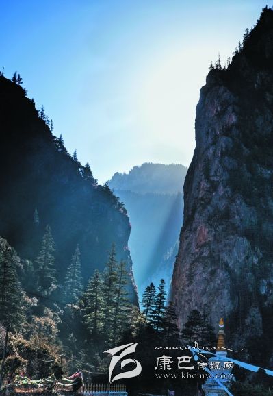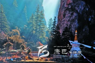 進(jìn)得溝來(lái),卻又是另一番景致。溪水在窄細(xì)的深谷中忽隱忽現(xiàn),水聲叮咚,時(shí)而從碎石卵灘下潛淌,時(shí)而冒出雪花樣的身影,不張揚(yáng),含靦腆,與兩邊千仞峭崖的兇猛樣恰成強(qiáng)烈對(duì)比。此時(shí)容不得你不抬頭望山,望天了。極盡險(xiǎn)峻的峭壁奇峰,危巖巨石,陰面如潑了墨暈,陽(yáng)面露了慘白,硬硬地把個(gè)溝谷擠成了“一線天”,駭?shù)谜锪锏奶焐弦粌蓤F(tuán)亂云也不敢停歇片刻,欲飄走,卻又被錯(cuò)落參差的山峰撕得七零八落。更有那墨黑如黛的松柏齊齊地排隊(duì)豎立在危崖峭壁間,或一兩階,或三四階,如挎刀武士護(hù)著峭崖,又如黑大漢長(zhǎng)的亂糟糟的絡(luò)腮胡,徒增添了猙獰之貌。傳說(shuō)皮察溝內(nèi)有座黑教的神山——呷拉神山,每到“朝山會(huì)”,農(nóng)牧民前去神山朝拜。然而,呷拉山頂不知何時(shí)棲居了一只碩大的“夏甲曲絨”(意為一種兇惡的鳥(niǎo)),不時(shí)將村里百姓的牛、羊叼到山頂吞食。藏王格薩爾得知此事,決心要除掉“夏甲曲絨”。 “夏甲曲絨”得知格薩爾王大軍前來(lái)征服它,十分懼怕,數(shù)日藏于洞中不敢出來(lái)。格薩爾王隱身于巖石背后,讓王妃珠牡設(shè)法引“夏甲曲絨”出洞。“夏甲曲絨”形體碩大,棲息的洞無(wú)法掩其全身,頭部露在外面,時(shí)時(shí)觀察動(dòng)靜。珠牡到接近洞口的地方,滔滔不絕地贊譽(yù)“夏甲曲絨”長(zhǎng)得美麗,它禁不住贊美,漸漸地伸長(zhǎng)頭頸,最后驕傲地露出潔白的全身,并高昂著頭。格薩爾王趁機(jī)迅速?gòu)埞罴?,一箭射?ldquo;夏甲曲絨”的頸部,血流滿山,以后這座山便變成了紅山。當(dāng)“夏甲曲絨”負(fù)痛逃至皮察溝“一線天”時(shí)已精疲力竭,便停留在山崖中。格薩爾王隨即趕到,藏于灌叢,背靠巨石用腳一蹬(至今天一巨石呈凹形,似有人蹬過(guò)),再次射中“夏甲曲絨”。“夏甲曲絨”負(fù)痛逃去,停在覺(jué)然村一巨石上做垂死掙扎時(shí),它的爪爪在巨石一抓了無(wú)數(shù)道溝痕,后人把這個(gè)巨大石稱(chēng)為“鬼抓石”……我無(wú)意去尋找“紅山”、“腳蹬石”、“鬼爪石”等,也沒(méi)想深究格薩爾除妖是否用過(guò)“美人誘惑計(jì)”,但卻在溝谷里發(fā)現(xiàn)一個(gè)與眾不同的現(xiàn)象:在一處窄小的谷地路傍,長(zhǎng)滿了雜枝黑蔓的灌叢,灌叢上彩幡密布,鉆進(jìn)灌叢,里邊竟然塑了一尊格薩爾王的神象,神象不高大,卻威儀,的確像是藏在崖壁下灌叢中……很容易讓人想到故事中的情節(jié)。