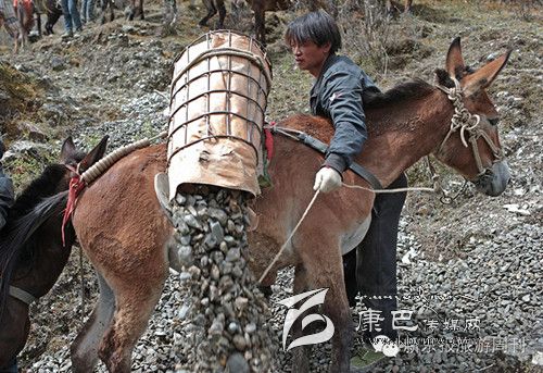 每天早上6點(diǎn)多,王玉海和同伴趕著騾子隊(duì),從白玉縣縣城旁邊的住地步行約1小時(shí)到達(dá)德沙村,約8開始從離索道橋約300米的路邊沙石場裝運(yùn)碎石。他們通常工作到下午5點(diǎn),每只騾子在海拔3000米左右的高度,來回運(yùn)送20次左右,每只騾子運(yùn)輸碎石大約在3000公斤左右。這些騾子正當(dāng)強(qiáng)壯年,年齡大約在三四歲,通常在坡度在30度以下的,最大負(fù)重約800斤。