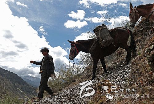 這是318和317國道都不通過的甘孜州白玉縣,從白玉縣城通往建設(shè)鄉(xiāng)德沙村的路是一條木制棧橋,2014年5月4日的中午,兩頭騾子在300斤石料的重壓下踩斷了中間的橋板,兩條前腿從踩碎的木板處懸著,騾子發(fā)出粗壯的喘息聲,無法掙扎,不能動(dòng)彈。棧橋上有路過的藏民,手中旋轉(zhuǎn)著轉(zhuǎn)經(jīng)筒,他口中念念有詞:騾子啊,你還沒有得到解脫。一群來自外地的游客都很驚詫。 騾子運(yùn)輸隊(duì)的王玉海,在過往行人和同行的騾隊(duì)鄉(xiāng)親的幫助下,先卸下騾子身上背負(fù)的碎石,然后手伸到騾子前腿根處,用力抬起騾子的前身。在查看騾子沒有受傷后,王玉海把這兩只騾子牽到騾隊(duì)最后面,然后,引著另外5只負(fù)重的騾子,從橋靠左邊的雙層木板橋面上通過,騾子隊(duì)受到驚嚇,不愿意上橋,王玉海安撫了一會(huì)兒騾子隊(duì)后,在同伴的協(xié)作下,前面牽引,后面驅(qū)趕,終于,王玉海的7只騾子過橋,其他8個(gè)同伴的50多頭負(fù)重的騾子也一一通過。