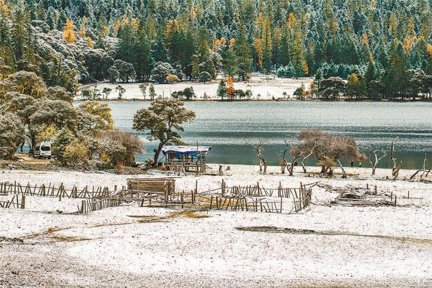 伍須海的色彩,四季都會變化,秋天最為精彩,滿湖的深綠,青黛的暗針葉林,金黃色的紅杉,火紅的槭樹,褐色的高山櫟,以及點(diǎn)綴于其間的沙棘果實(shí),都五彩繽紛地點(diǎn)染著這張“畫布”。