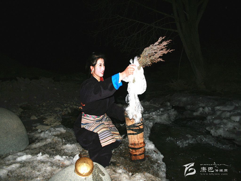在除夕這天,家里的婦女會把庭院,房屋重新打掃一遍。把垃圾再清理一次。因?yàn)榱?xí)俗認(rèn)為,初一掃地和除垃圾會把一年的財運(yùn)和好運(yùn)都掃走。這天,大人小孩還要忙著洗頭、洗澡,搞好個人清潔衛(wèi)生。而除夕之夜最重要的一個儀式是“搶頭水”。(新年的第一桶水—晨星水)。傳說,晨星水是人間最吉祥的水。它可以獻(xiàn)神,可以潔身,可以祛病,洗滌一切污垢和不祥,帶來平安和幸福。從除夕夜十二時開始,一個個懷抱柏樹枝和哈達(dá)的姑娘或小伙子們披著繁星,爭先恐后地去背晨星水。第一個先到河邊的要熏燃桑煙,并用哈達(dá)繞上柏樹枝蘸水向空中拋灑三次,并把柏樹枝放在河邊。背回的晨星水首先要供奉佛祖。然后才可以用來燒茶、洗漱。而家里的五谷斗上則盛滿了糌粑、炒青稞粒、人參果等食品,上插青稞穗,也有在八寶碗里用糌粑和五彩酥油做成“切巴”,供奉在佛堂里。這一切都是為了祈禱來年風(fēng)調(diào)雨順、人畜兩旺、喜獲豐收。除夕夜,在正房桌子上還要擺上各式油炸果子、牛肉坨坨、糖果以及青稞美酒、飲料等等美味佳肴,開始迎接新年的到來。