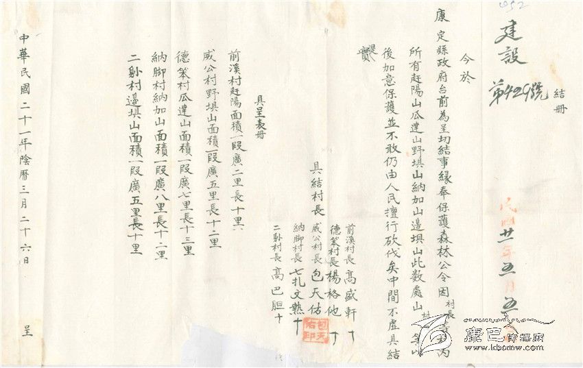 布告張貼出去后,大渡河流域康定縣屬的前溪、德笨、納腳、威公、二朗等五個(gè)村長(zhǎng)向縣政府寫(xiě)出了由自己親自簽名畫(huà)押的“具結(jié)書(shū)”,把自己村落所在地的林林面積造出表冊(cè)“具呈”,并保證“以后加以保護(hù),不敢仍由人民自由砍伐”。