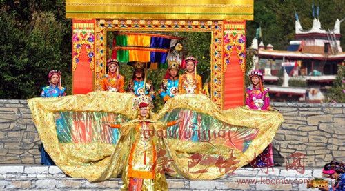 在催人奮進(jìn)的戰(zhàn)鼓聲中,一群身披甲胄的士兵拿著長劍,背著巨弓走到臺(tái)前,在鏗鏘的戰(zhàn)鼓聲中,戰(zhàn)士們做著各種競技動(dòng)作,模仿武士們互相攻擊的樣子,那矯健的身影展示了遠(yuǎn)古時(shí)代嘉絨藏族先民們?yōu)榱松媾c自然努力抗?fàn)幍膱鼍啊_^了一會(huì)兒音樂一轉(zhuǎn),戰(zhàn)鼓聲漸漸減弱,在鳥雀的陣陣啾啾聲中,一座木門慢慢的開啟,一位身披長袍、頭戴鳳冠的女王在眾多美女的簇?fù)硐拢従徸呦屡_(tái)階步入舞臺(tái)中央,此時(shí),一位手捧托盤的老者來到女王面前單膝下跪,將托盤高舉過頂,并邀請女王品嘗佳肴,女王將中指在酒中蘸了蘸,并曲起中指向四周輕輕彈去,寓意愿將杯中美酒與四方百姓同飲。在女王面前還放置著一個(gè)凈水桶,桶中盛滿了清澈的甘泉,桶上橫放著一枝柏樹枝,女王伸出纖纖玉手,拿著柏樹枝在水中蘸了蘸,面向墨爾多神山撒去,寓意向神山祈福。這是此次《美人谷·丹巴》節(jié)目展演中的序曲部分,有著強(qiáng)烈的東女神韻,將遠(yuǎn)古時(shí)代東女國女王遺風(fēng)展演的淋漓盡致。