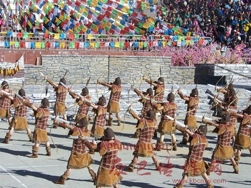 10月26日,在甲居藏寨,處處洋溢著豐收和歡樂的氣氛,人們扶老攜幼,身著節(jié)日的盛裝走到一起,來共同慶祝丹巴嘉絨風(fēng)情節(jié)的順利召開。在一塊空地中,搭建了臨時(shí)的舞臺(tái),看臺(tái)上,幾座古碉模型傲然挺立,在不遠(yuǎn)處,一座古碉矗立在一座小山包上,與古碉模型遙相呼應(yīng)、相映成趣。上午9時(shí)40分,當(dāng)節(jié)目主持人宣布嘉絨風(fēng)情節(jié)正式開始時(shí),一束束搖曳的煙花向空中飛去,在空中炸響后,散發(fā)出五顏六色的煙霧,其中有的還幻化成幾多小小的降落傘,就像多多盛開的鮮花在空中綻放。演出現(xiàn)場前的大地和遠(yuǎn)處的小山坡上到處都站滿了熱情的觀眾,合著禮花的爆裂時(shí)的響聲,將手中的小紅旗展開,高舉過頭頂,有節(jié)奏的左右搖動(dòng),霎時(shí)間,整個(gè)現(xiàn)場成為了紅色的海洋。