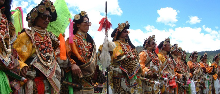 康巴牧區(qū)服飾,男女老少秋冬季均以厚重的原生皮板老羊皮、羔羊皮為袍,上飾粗獷的五色布、呢料條紋或“雍宗”、日月等圖案紋裝飾,夏裝則常以輕、薄的各色面料或自織牛羊毛呢制成的單或夾的長袍。上鑲彩虹氆氆尼花邊,康北一些農(nóng)區(qū)還時(shí)興針織栽羊毛的袍、褲、衣等。男戴寬沿白氈帽,女梳百辮,戴羊皮帽,耳、項(xiàng)、胸、腰、背、腕、手佩各種用金、銀、珠玉、寶石制作鑲嵌的飾品。禮儀節(jié)日盛裝選料更為華貴、精美。