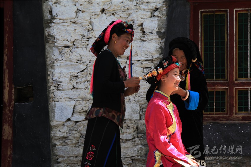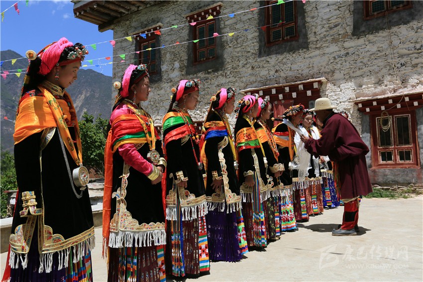 丹巴嘉絨藏族女子的成年禮一般以自然村落為單位,舉行的時間需請喇嘛或貢巴擇吉日,或在農(nóng)事有閑的時候。參加成年禮的成年女性人數(shù)不定,可集體、也可以單獨舉行,其原則是女子必須歲足17歲;若已足17歲,如遇農(nóng)事繁忙,也可適當延期。