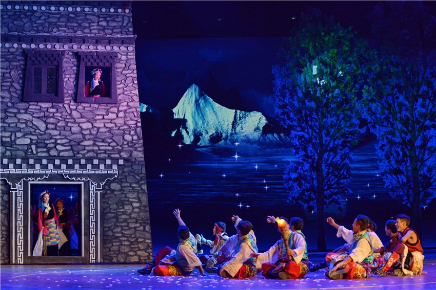 第二場 《慧明》,圍繞亞丁央邁勇(文殊)神山文化,用歡快的歌舞藝術(shù)展示幸福生活的智慧。把民俗舞臺化,舞蹈儀式化,對雪山、江河表達感恩敬畏之情,體現(xiàn)人與自然和諧相融,對生態(tài)保護的尊重。同時通過傳統(tǒng)歌舞和自然風光相融合展示藏民族特有的淳樸和快樂。