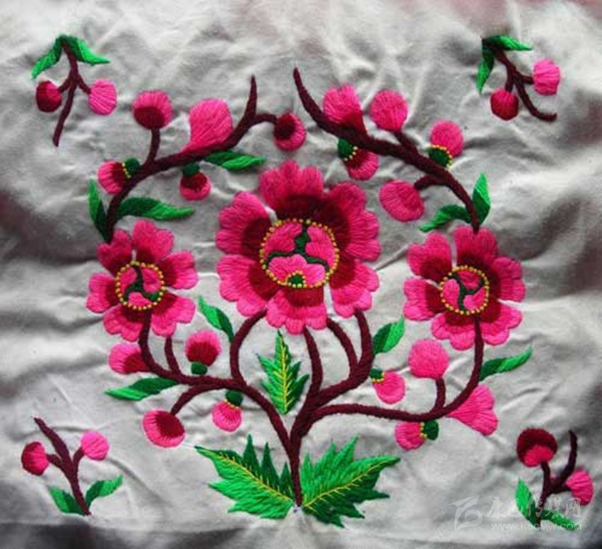 在這里,婦女們猶愛(ài)花草。所以,他們的刺繡作品,有生活的細(xì)節(jié)滲透,如氣息,若有似無(wú),相互浸潤(rùn)。無(wú)論是花蔓纏枝,還是朵花團(tuán)簇,都從生活中提煉,視之便信手拈來(lái),放在青布黑衫之上,鮮艷奪目,張顯著生活在這方水土之上,人們獨(dú)特的審美情趣。