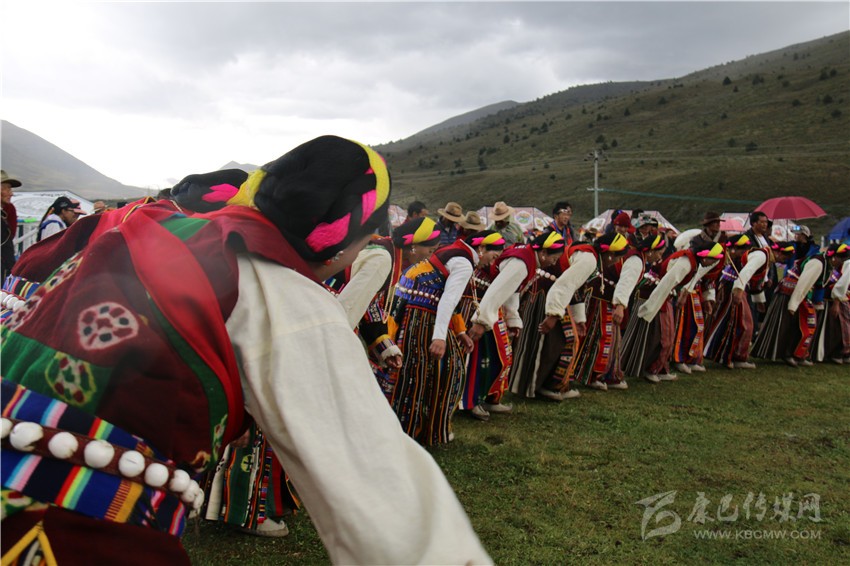 10月2日,在木雅鍋莊悠揚的旋律和輕盈的舞步中,歷時兩天的“2017康定情歌國際音樂節(jié)”盛大開幕,作為“五大民俗展演”中的特色民俗歌舞表演部分,木雅鍋莊吸引了眾多游客的關(guān)注。木雅鍋莊來源于木雅人的日常生產(chǎn)和生活,是當(dāng)?shù)剞r(nóng)耕文化習(xí)俗的重要表現(xiàn),表演服飾多以棕紅色外套,紅、白色襯衫為主,表演者多佩戴紅頭繩、珊瑚、金銀等裝飾物。舞蹈分男女兩組,列隊圍桌成圓形,皆彎腰垂首隨領(lǐng)唱歌聲而舞。男組舞姿氣勢豪放,女組舞姿委婉優(yōu)雅。唱腔宛轉(zhuǎn)悠揚,吸引了在場觀眾冒雨駐足觀看,有的甚至情不自禁隨著舞群踏起了舞步,融入到康巴文化的神秘魅力當(dāng)中。