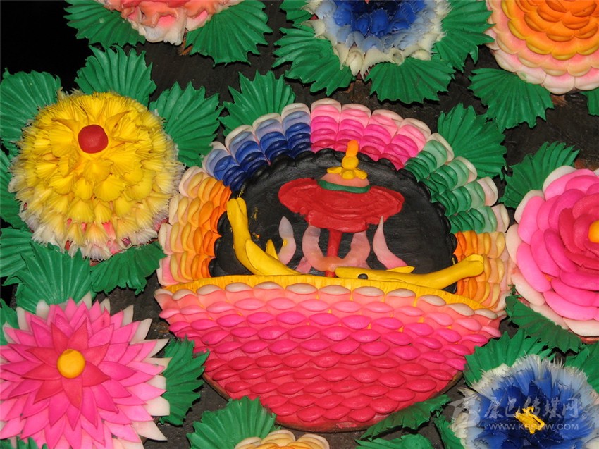 制作酥油花先是“扎骨架”根據所表現的內容,用加工的柔軟草束、麻繩、竹竿、棍子等物扎成大大小小不同形態(tài)的“骨架”,即所塑造的基本模型。其次是“做胚胎”,塑造的第一道原料是用上年拆下來的陳舊酥油花摻和上草木灰反復捶打,制成韌性好彈性強的黑色塑造油泥。然后裹在骨架上完成粗糙但準確的一個個大造型,其塑法近似面塑或泥塑。再次是“敷塑”,塑造的第二道原料是在加工成膏狀的乳白色酥油中揉進各色礦物質顏料,調和成五顏六色的油塑原料,仔細的涂塑在做好的形體上,有的還要用金、銀粉勾勒,完成各色形象的塑造。要是塑造紅花綠葉,或是玲瓏剔透的玉石寶玩,則直接用彩色油料一次塑成。為了防止塑制中因手的溫度而使酥油胚料融化變形,藝僧們在室溫控制在零度的作坊里,身邊放有一個盛有冰塊的水盆,他們要不時將手浸入冰水中。整個制作過程十分艱辛,藝僧們的手上大多會生出凍瘡。對佛教的虔誠和對藝術至美的追求,完全超越了肉體上的痛苦,冰冷的手中,艷麗的酥油花不斷生成。最后酥油花一道工序是“裝盤”,將塑好的酥油花按設計的總圖要求,用鐵絲一一安裝到位,固定在幾塊大木板上或特制的盆內,高低錯落有致,件件立體懸空,觀賞者可以從不同的角度觀瞻玩味。布局成單一的花卉圖案或整幅的故事畫面,俗稱“酥油花架”,展出時,“酥油花架”會用高桿立起,最高可達十幾米,人們在下以仰視角度觀看,更覺佛法莊嚴,寶像生輝。一座大的花架上,往往要塑造幾十個、甚至一二百個人物組成的故事畫面。其中菩薩金剛端坐安詳,飛天仙女身姿綽約,花鳥蟲魚栩栩如生,人物神形兼?zhèn)洌づ_樓閣金碧輝煌,整個畫面繁而不亂,絢麗多彩,令人嘆為觀止。