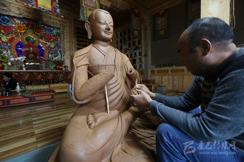 見到克村時(shí),他正在鄰村一農(nóng)戶的經(jīng)堂里制作佛像,盤坐在蓮花寶座上的宗喀巴大師和兩個(gè)弟子身披袈裟手持經(jīng)書的泥塑作品神形兼?zhèn)?,這是克村和徒弟多登近半個(gè)月的心血。克村坐在布?jí)|上,心無旁騖神情專注地,用木制工具對(duì)作品進(jìn)行打磨,旁邊擺放著一盆清水和一筐自制的工具。