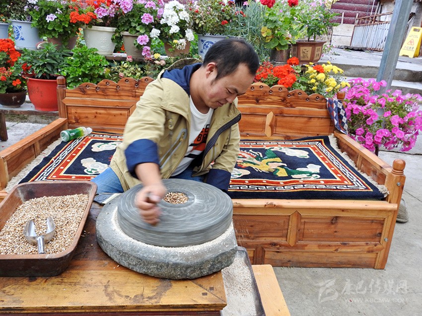 扎呷介紹說:水淘糌粑的制作工藝非常講究,分四步。首先要選用優(yōu)質(zhì)青稞風(fēng)干篩好,放入山泉水中洗凈、曬干,再用熱水淘洗,瀝干水分趁熱裝人麻袋密封,保持恒溫,放上一夜。第二天,燒熱平底大炒鍋,揭開麻袋自然會(huì)聞到一股酒香味,然后倒人炒鍋,不停翻炒。炒青稞關(guān)鍵要掌握好火候,不焦不生,出現(xiàn)青裸花后就炒好了。待炒好的青稞冷卻后,裝入皮口袋,送到磨房,經(jīng)水磨磨出的糌粑,粉細(xì)、色澤潔白、味香可口。