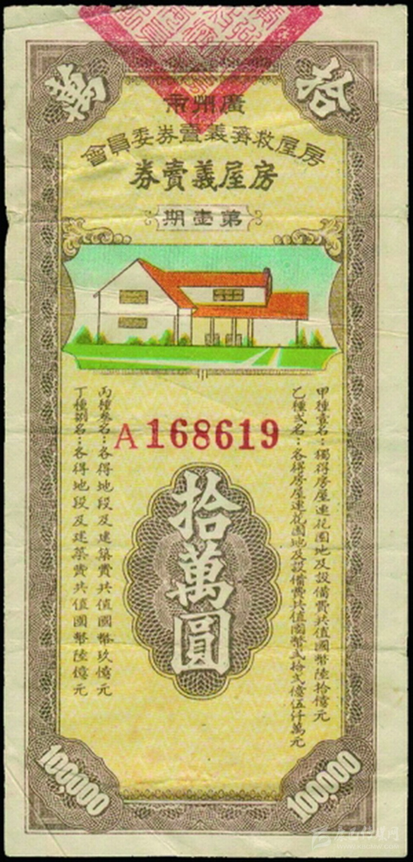 1948年2月,廣州市房屋救濟(jì)義賣券委員會每月發(fā)行一次房屋義賣券。第一期房屋義賣券面值10萬元,共發(fā)行30萬張。設(shè)甲、乙、丙、丁種中獎?wù)吒?、2、3、8名,其中甲種獨(dú)得房屋連花園地及設(shè)備費(fèi)共值國幣六十億元,乙種各得房屋連花園地及設(shè)備費(fèi)共值國幣二十二億元五千萬元,丙種和丁種得土地及建筑費(fèi)分別值九億元、六億元。第二期房屋義賣券仍發(fā)行30萬張,但每張面額上升到國幣20萬元,獎項(xiàng)變?yōu)橹歇務(wù)呒追N1名,獨(dú)得房屋兩間及設(shè)備費(fèi)十億元;乙種2名,各得房屋兩間;丙種3名,各得房屋一間另設(shè)備費(fèi)五億元;丁種4名,各得房一間。