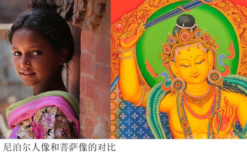 特別值得注意的是:之前佛教藝術(shù)的帕拉風(fēng)格繪畫(huà)中的臉型普遍是方正偏長(zhǎng)的,而在尼瓦爾唐卡里,臉型普遍是方正偏短。偏短的方臉會(huì)讓五官顯得更加集中一點(diǎn),特別是眉額比較大、眼睛位置下移,這樣的感覺(jué)有點(diǎn)近似于嬰兒的面部比例。而眉骨、鼻骨高挺,又不似兒童,這樣的面部特征其實(shí)和尼國(guó)人的長(zhǎng)相比較接近。也許是尼瓦爾人善于觀(guān)察、擅長(zhǎng)描摹的天分,逐漸把本民族沉靜的性格與容貌,潛移默化地滲透進(jìn)了唐卡,產(chǎn)生了新的風(fēng)貌。