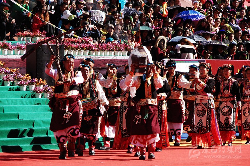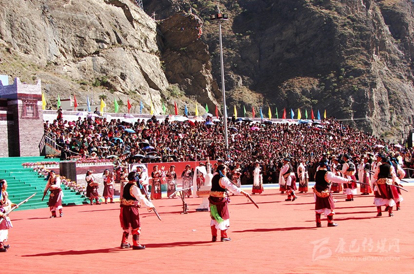 槍舞,嘉絨語中稱為“訥沖呷兒”,主要是在祭祀、集會、節(jié)日時表演的一種近似于戰(zhàn)術(shù)的舞蹈。在舞蹈中,舞者圍成一個圓圈,手持明火槍,明火槍,是最早的一種真正適于在戰(zhàn)場上為軍事目的使用的火槍。槍膛為一根圓柱形的鐵筒,筒口直徑為三厘米左右,在槍膛底部,有一個小圓孔伸出槍管,為導火管。如耳朵狀,因此也稱為槍耳,主要是用來點火的地方。圓筒固定在堅硬的木托頂端。這種輕火器或者說小型火炮使用的是形狀不規(guī)則的彈丸,即不大的實心彈,它緊貼大?;鹚幹瞥傻难b藥,借緊挨導火孔的火繩發(fā)射。