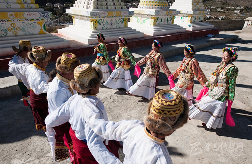 這當(dāng)中最具有依憑的觀點(diǎn)是:“學(xué)羌”是藏族傳說人物江根阿坡創(chuàng)作的,他綜合了康巴三江沿岸的鍋莊與踏歌的舞步,又融入了滇西北少數(shù)民族的一些舞蹈元素。從歷史上看,得榮瓦卡(茶馬古道金沙江碼頭)曾是茶馬古道上的一座重鎮(zhèn),各民族的馬幫和商人曾集聚在瓦卡碼頭?;蛟S,人們常常在這里載歌載舞,久而久之,在碰撞和交流中慢慢融合出了一個新的舞蹈:學(xué)羌。