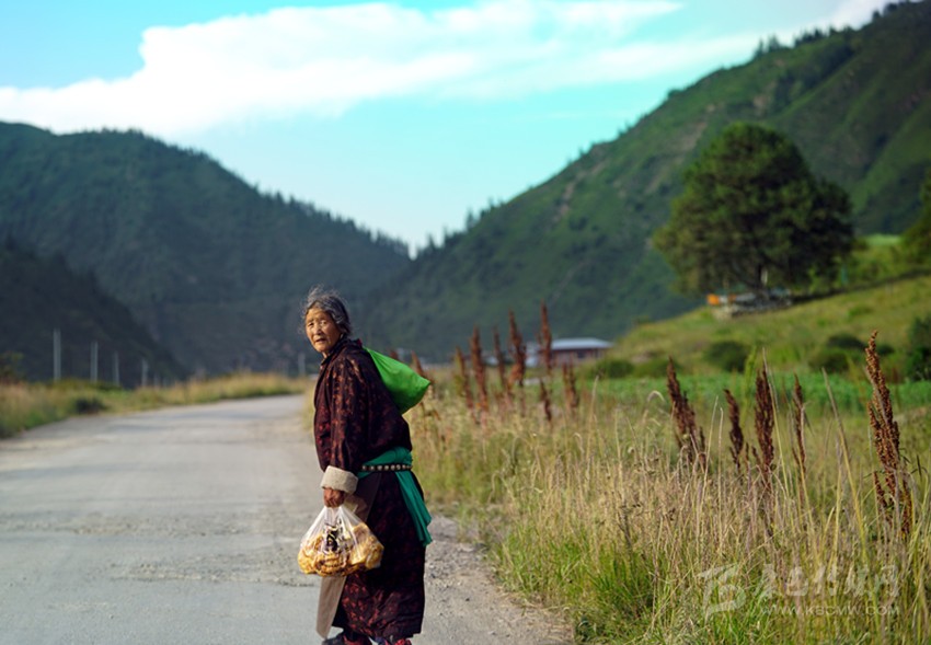 開始收割了,從坡地到川地,到處是收割機(jī)的聲音。青稞是車巴溝的主要作物,因?yàn)橐デ囡?,要吃糌粑。村里人忙得團(tuán)團(tuán)轉(zhuǎn),收割機(jī)開過去,大家就跟在后面撿穗子。如此往復(fù),一直要到糧食拉到家里。