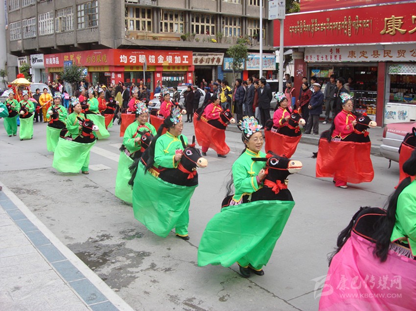 半個(gè)世紀(jì)風(fēng)靡康定城的“船燈”、“馬馬燈”、“鬧山鼓”、“扭秧歌”、“笑頭和尚戲柳翠”、“霸王鞭”……整個(gè)兒就像老陜過年時(shí)的“社戲”場面。大年初一、十五夜“出燈”游街,熱鬧氣氛把整個(gè)年節(jié)塞得滿滿的。記得我孩童時(shí)見過一次“出燈”游行,不是晚上而是在大白天(叫“出游”)。寺廟喇嘛吹奏佛樂走在前面,接著是“川北”人的川劇鑼鼓;再后面跟著的就是“馬馬燈”、劉老陜的“船燈”、鐵木社的“龍燈”、二輕局的“霸王鞭”、南門上的弦子隊(duì)、三居委的腰鼓隊(duì)、北三巷的“道孚鍋莊隊(duì)”……游行隊(duì)伍遇街口寬敞地方必圍圈演出?!叭死侠玻死侠?,人老先從頭上老,白的多來黑的少, 開——船——羅!”“銀須飄灑”的艄公劉老陜用俏皮逗趣的陜腔告白開場詞,在歡喜鑼鼓的伴奏中“劃”著旱船出了場。旱船闖“急流”、過“險(xiǎn)灘”,風(fēng)趣又逼真;如果哪家的姑娘打扮成古裝戲里的嬌美仕女坐上旱船游了街,那她立馬就成了康定城人皆贊譽(yù)的“美女”。接著就是“馬馬燈”,幾十個(gè)“騎馬橫槍”的古裝將士馳騁上場,排兵布陣,穿梭并行,“馬”鈴聲鼓樂聲交織一起……鬧翻了康定城的“三山二水”。