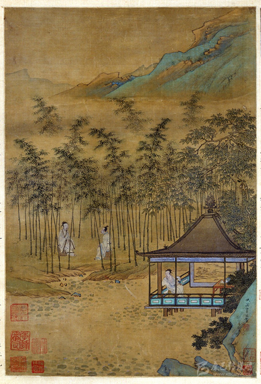 此圖意境極像唐代詩人王維的藍田山別墅。這里林木茂密,山澗淙淙,館舍、房屋散布其間,每到夏季,山風(fēng)習(xí)習(xí),涼爽怡人,王維和文友們在此度夏避暑,垂釣飲酒,談?wù)撛娢?,修身養(yǎng)性,過著悠閑自在的隱居生活。他在《竹里館》一詩里寫過自己的隱居快樂感受:“獨坐幽篁里,彈琴復(fù)長嘯。深林人不知,明月來相照?!比姼裾{(diào)幽靜閑遠,仿佛詩人的心境與自然的景致全部融為一體了。宋朝詩人楊萬里喜歡在皎潔的月光之下,清輝孤影,來到搖曳的竹林中,聽著夏夜里悅耳的蟲鳴,夜深氣清,盡管沒有涼風(fēng)送爽,但是悶熱暑氣頓時消失,于是他寫了一首《夏夜追涼》詩:“夜熱依然午熱同,開門小立月明中。竹深樹密蟲鳴處,時有微涼不是風(fēng)。”