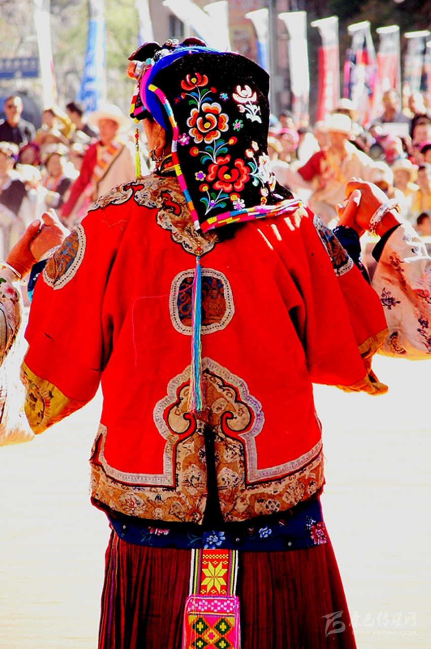 這些服飾雖歷經(jīng)歲月的滄桑,依然被完整的保存下來(lái)。如今,在上下宅龍村寨里,保存完整的有五十余套。每一年,村寨里舉辦活動(dòng)時(shí),村寨里的婦女們從木箱里取出這些服飾,小心翼翼地穿在身上,載歌載舞。在她們舞動(dòng)的時(shí)候,仿佛被這些服飾帶入幾百年前的時(shí)光里,時(shí)空在這一瞬間已完全改變。這時(shí)候,服飾上艷麗的圖案將舞者們襯托得更加美麗動(dòng)人,無(wú)怪乎《章谷屯志略》中有“逢慶典時(shí)著蟒衣文繡亦頗美觀”這樣的記載。