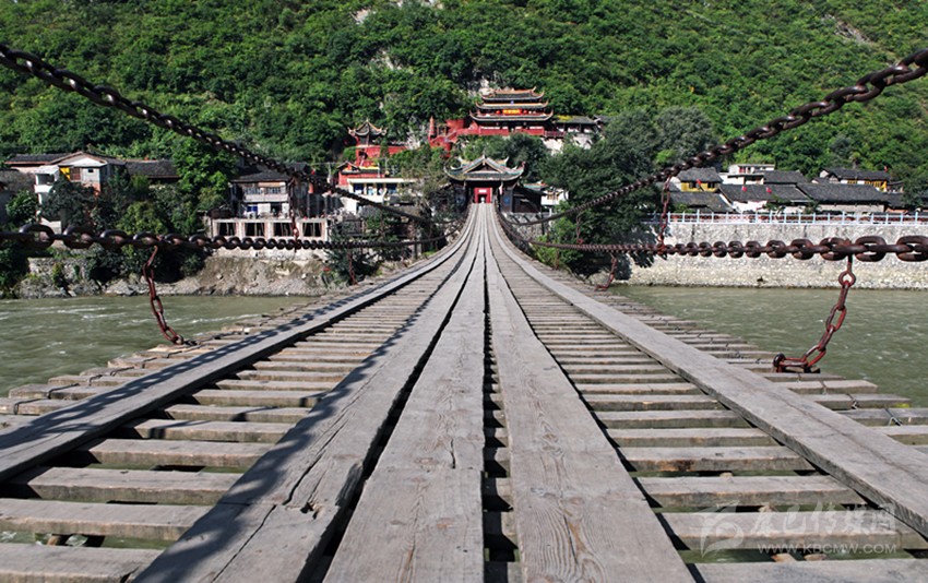 手握粗大烏黑的鐵鏈,感覺得到它的滄桑歷史與厚重沉淀,當(dāng)年的工匠甩起膀子捶打鐵鏈時四處飛濺的火星,仿佛在眼前不停噴酒;扣住碩大亮堂的鐵環(huán),簡直是在觸摸久遠歲月的流失與人非物是的變故;當(dāng)年匠人舉著大手操起鐵鉗子將滾燙通紅的鐵環(huán)放入水中時發(fā)出“哧哧哧哧”的聲音似乎在耳旁久久回蕩;踩踏橋面上的板子,分明看見當(dāng)年舍死忘死的勇士們在硝煙彈雨之中匍匐前進,犧牲紅軍戰(zhàn)士殷紅的鮮血染紅了大渡河的浪花;凝視滾滾翻騰的波濤,依稀可見當(dāng)年民眾將鐵鏈糸在竹筒上兩頭對拉的場景,眾人在兩岸使力時發(fā)出“嗨約嗨約”的吆喝聲地動山搖震撼人心……