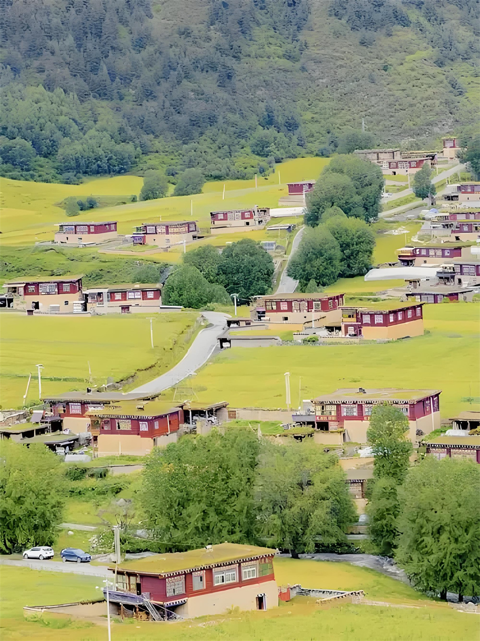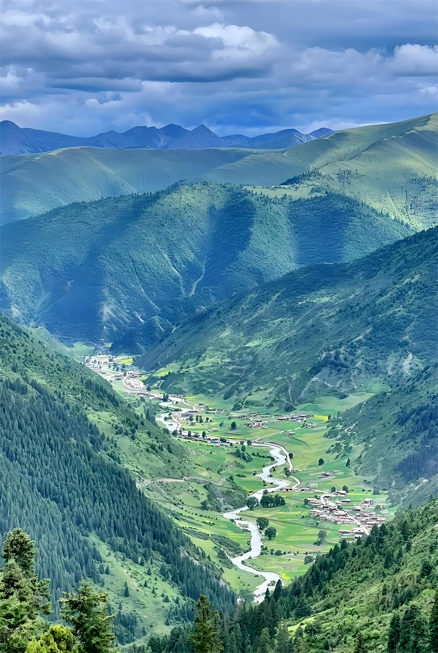 眼前,河谷兩旁的青山上,長(zhǎng)滿參天古樹(shù),像一個(gè)個(gè)衛(wèi)士守護(hù)著這片綠洲;沙魯里山脈的冰雪融水順著蜿蜒的麥曲河,澆灌著兩旁綠意蔥籠的青稞地、豌豆地,滋潤(rùn)著彌漫香味的種有中藏藥材的土地;絳紅色藏房散落在河谷間,不時(shí)有小孩打開(kāi)窗戶,探出小腦袋,羞澀地露出滿臉燦爛的笑容;臉上布滿高原紅的阿姐沖我們打招呼,說(shuō)著我們不太懂的藏語(yǔ),充滿熱情。