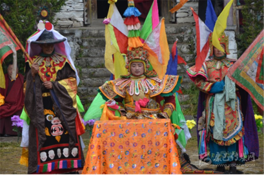 思路還是回到戲劇問題上來,在我以往欣賞的藏戲,其演出場所都設(shè)在露天,演員和觀眾在同一平臺的草地上,有時(shí)在平臺四周有山坡,那便是觀眾最好的看戲處。不過,從高處往低處看,效果還是不及平視的效果好。表演藏戲的舞臺在草地中央,觀眾圍著中央草地形成一個(gè)半包圍圈,演出幾乎沒有布景,即便有,也是簡單的一些桌椅、祭臺之類的簡單道具。在演出中,一個(gè)演員身著各類色彩鮮艷的帽、旗及其盔甲服裝等大于人體體型的飾物,這樣做的目的顯然是為了增強(qiáng)演出的鮮明性,尤其演員穿著厚底高靴,體型龐大,頭戴面具,嗓音洪亮,動作凝重而富有節(jié)奏,使整個(gè)演出富有較強(qiáng)的穿透力和沉重感。藏戲的音樂也比較簡單,主音節(jié)奏依靠長號、大鼓、鈸等,曲目轉(zhuǎn)換時(shí)則多以笛子演奏,間或插入海螺聲、嗩吶聲等。整個(gè)藏戲的故事情節(jié)則是依靠舞蹈和合唱來漸次推進(jìn)的。藏戲作為祖國文化大家庭中的成員之一,自然有著自己獨(dú)特的特點(diǎn),有著屬于自身的文化藝術(shù)和生活土壤的傳承因子。藏戲誕生在一個(gè)特殊的環(huán)境里,它既在風(fēng)格、形態(tài)、特征和韻致上包含著與其他戲劇相似的共通性,同時(shí),它又蘊(yùn)涵著與眾不同的自身的內(nèi)涵特征??傊貞蛟凇案?、舞、劇、技等方面的有機(jī)結(jié)合,虛擬寫意的表現(xiàn)型戲劇,程式化表演手段,自由靈活的演出時(shí)空概念,??????它又具有與古希臘戲劇很類似的貫穿始終的講解人和伴唱伴舞隊(duì),面具表演,三面以至四面觀眾的廣場演出,一部分生活化寫實(shí)表演,演出時(shí)空的間接固定場景,史詩式講唱文學(xué)的劇本結(jié)構(gòu)和說唱藝術(shù)的演出格式等特殊之處?!薄緞⒅救骸吨袊貞蚴贰?/span>4頁】因此,在藏戲的諸多元素中,我們可以看到顯著的特征,這就是明顯的原始巫文化和原始苯教文化的痕跡,無論是在藏戲的臺詞、面具和服飾中,還是在藏戲的音樂、樂器和表演形式上,不難看出藏戲的這一本土特征,至于與其他戲劇流派的類似之處,我以為,一方面是戲劇本身固有特征的表現(xiàn),另一方面或許是一種合理吸納所致。
