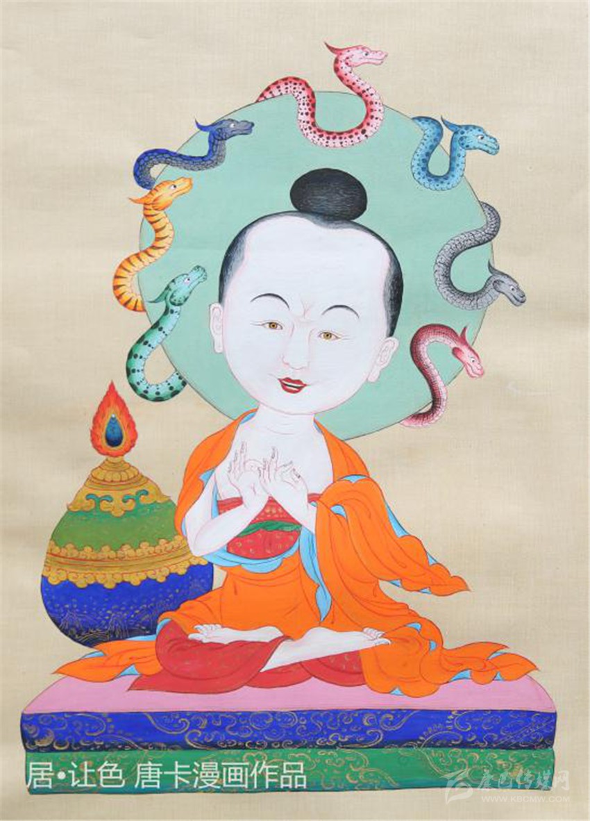 他創(chuàng)作的漫畫唐卡是以藏族傳統(tǒng)唐卡藝術(shù)為支點,融合現(xiàn)代漫畫風(fēng)格方式表達的繪畫作品。居?讓色2018年展出的九副唐卡作品《青春永駐的六勝二莊嚴》是藏族唐卡繪畫史上的第一個傳統(tǒng)與現(xiàn)代繪畫藝術(shù)相結(jié)合的精品唐卡。