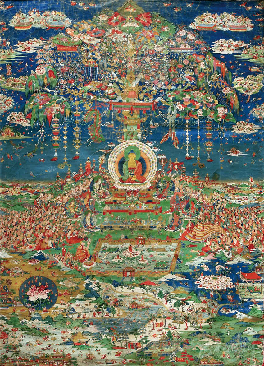 具有超越凡人的精微刻畫能力,也使得郎卡杰在面對畫布時(shí),有更廣大的空間來展示他的繪畫天賦。從存世的作品《無量光佛凈土》中,看得出郎卡杰喜歡將自己的“毫毛畫師”的能力發(fā)揮到極致。不管是花紋、瓔珞、還是人物,但凡是畫面上出現(xiàn)的物象,他都會(huì)以精致、繁密的形式出現(xiàn)。所以他的畫面世界里往往都是人山人海、琳瑯滿目;盈寸之間,容納萬千;場面浩瀚、氣勢恢宏、不可思議!