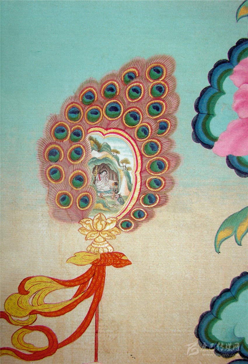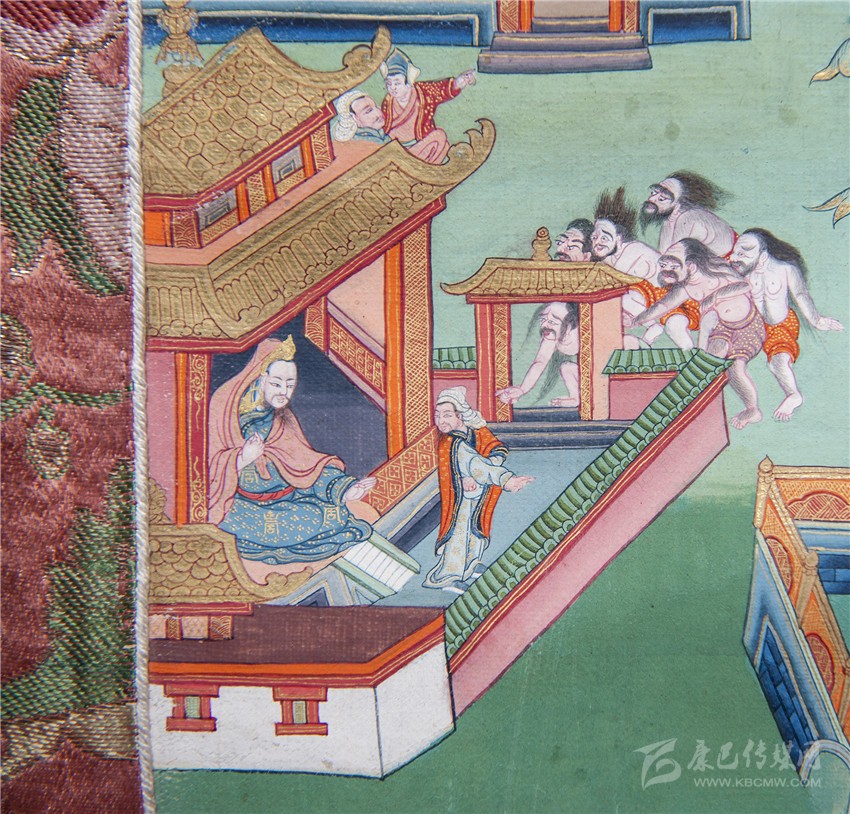 再看《如意寶藤》的另一個(gè)局部,對比唐卡裱邊,我們可以看出大約十公分見方的畫面里,郎卡杰描繪了十個(gè)人物和一棟宮殿,畫面還顯得很疏朗;圍墻外的“邪魔外道”身上不僅分染了體積,還描繪了五官須眉和汗毛。漢式宮殿內(nèi)外墻磚上,還刻畫了精微的花紋和裝飾,郎卡杰的“神變”畫技由此可見。而這樣的微型畫中畫,在郎卡杰作品中大量存在,精彩絕倫。圖二《如意寶藤》局部