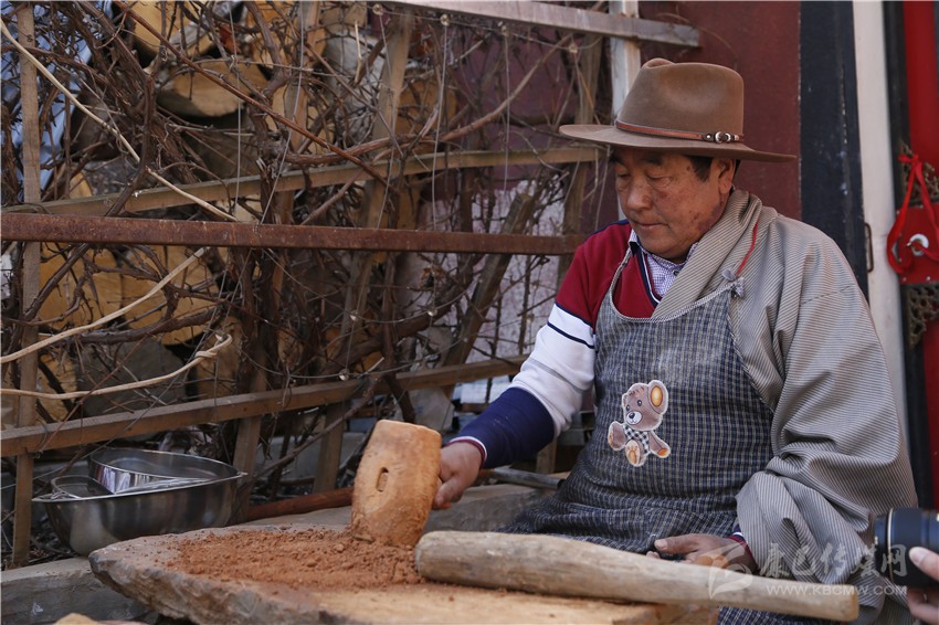 四龍降澤將一塊塊雌雄泥放在平坦的石頭上,用木錘敲打,泥土被打散后,用石頭研磨,再通過(guò)木篩濾出最細(xì)的泥土備用,接著把以紅景天為主的60多種中草藥、香果為主的20多種香藥和60多種藏藥以及珊瑚、綠松石、瑪瑙等組成的80多種寶石和80多種宗教圣物稱量,按照一定的比例與泥土混合,繼續(xù)將藥物與泥土搗碎、研磨直至混為一體,然后把取自海拔4600米以上無(wú)污染的水將泥土、藥物和在一起,然后用類似搟面杖的木棒捶打并揉成面團(tuán),放入地窖發(fā)酵7天直至香味溢出。