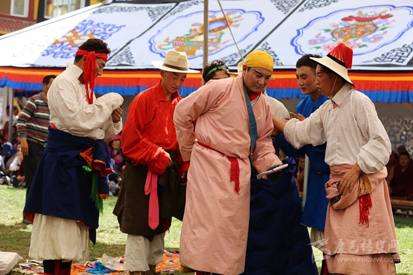 不過(guò)依照習(xí)慣,大家還是要募捐。誰(shuí)家募捐了多少,藏戲團(tuán)會(huì)在“央勒節(jié)”的最后一天,即藏戲演出的尾聲“扎西交”上道謝。“扎西交”有幾層意義,祝賀本次“央勒節(jié)”功德圓滿,祈愿來(lái)年五谷豐登幸福安康,感謝上天賜予大地的恩惠。演員們向供奉在大帳篷中央的祖師爺唐東杰布莊重磕頭,把撒糌灑向天空,謝幕,“央勒節(jié)”便在熱烈的氣氛中結(jié)束了。每當(dāng)聽到話筒里喊出:“XX顧伙(顧伙:巴塘方言藏語(yǔ),即搭帳篷的某一家),捐款XX元,道謝了!”時(shí),大家都會(huì)生出不舍與惆悵之感,撤帳篷回家,日子又恢復(fù)到平常的瑣碎里了。