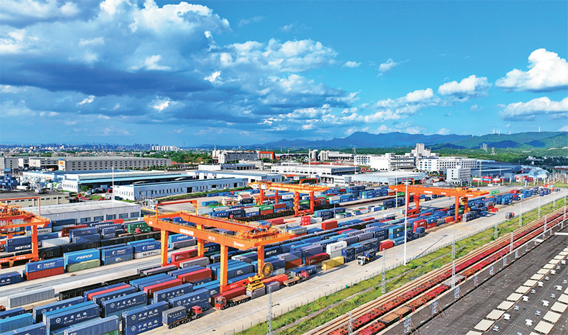 圖為2024年5月5日,江西省贛州市南康區(qū),贛州國際陸港車來車往、貨如輪轉(zhuǎn),起重機在裝卸進(jìn)出口貨物集裝箱。 人民圖片 朱海鵬/攝