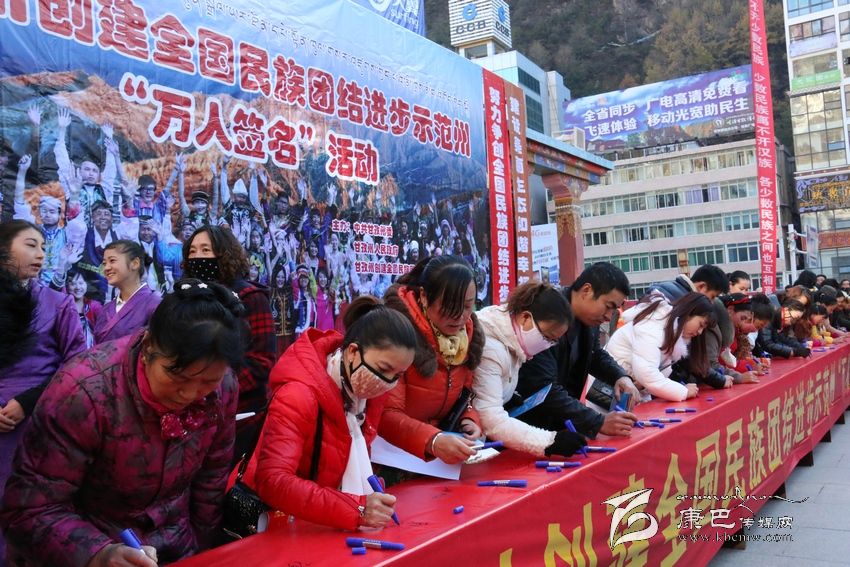 州人大常委會(huì)副主任李致民宣布創(chuàng)建全國民族團(tuán)結(jié)進(jìn)步示范州“萬人簽名”活動(dòng)正式開始后,州領(lǐng)導(dǎo)汪洋、李致民、楊國元、范文華、蔣秀英、楊學(xué)康以及甘孜軍分區(qū)、駐州武警部隊(duì)領(lǐng)導(dǎo)同州級(jí)機(jī)關(guān)、志愿者、個(gè)體工商戶、學(xué)生、駐軍、政法干警、康定縣黨政機(jī)關(guān)干部代表近千人,陸續(xù)到“萬人簽名”條幅上簽下了自己的姓名。