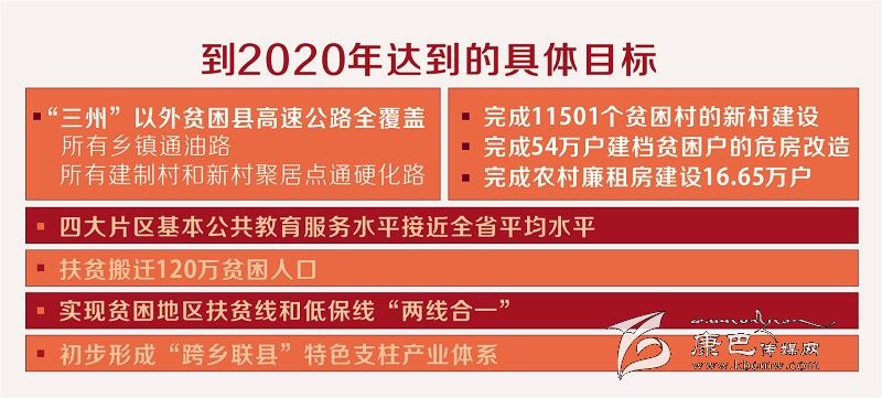 方案提出,到2020年“三州”以外貧困縣高速公路全覆蓋,所有鄉(xiāng)鎮(zhèn)通油路、所有建制村和新村聚居點(diǎn)通硬化路;完成11501個(gè)貧困村的新村建設(shè),全面完成54萬(wàn)戶建檔貧困戶的危房改造,完成農(nóng)村廉租房建設(shè)16.65萬(wàn)戶;四大片區(qū)基本公共教育服務(wù)水平接近全省平均水平;扶貧搬遷120萬(wàn)貧困人口;實(shí)現(xiàn)貧困地區(qū)扶貧線和低保線“兩線合一”;初步形成“跨鄉(xiāng)聯(lián)縣”特色支柱產(chǎn)業(yè)體系等多項(xiàng)具體目標(biāo)。最終,確保省委提出的497.65萬(wàn)農(nóng)村貧困人口全部脫貧、11501個(gè)貧困村和88個(gè)貧困縣全部“摘帽”,貧困縣農(nóng)民人均純收入比2010年翻一番以上,實(shí)現(xiàn)基本公共服務(wù)均等化、社會(huì)保障全覆蓋的目標(biāo)全面實(shí)現(xiàn)。