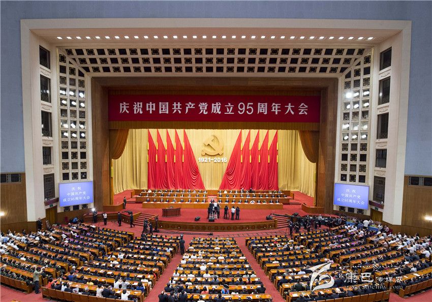 人民大會堂雄偉莊嚴,萬人大禮堂燈火輝煌。主席臺上方懸掛著“慶祝中國共產(chǎn)黨成立95周年大會”會標(biāo)。帷幕正中,由鐮刀和錘頭組成的中國共產(chǎn)黨黨徽在十面紅旗映襯下熠熠生輝,“1921-2016”字樣格外醒目。大禮堂二層眺臺懸掛橫幅:緊密團結(jié)在以習(xí)近平同志為總書記的黨中央周圍,銳意進取、開拓創(chuàng)新,全面推進黨的建設(shè)新的偉大工程,為實現(xiàn)“兩個一百年”奮斗目標(biāo)、實現(xiàn)中華民族偉大復(fù)興的中國夢而努力奮斗!
